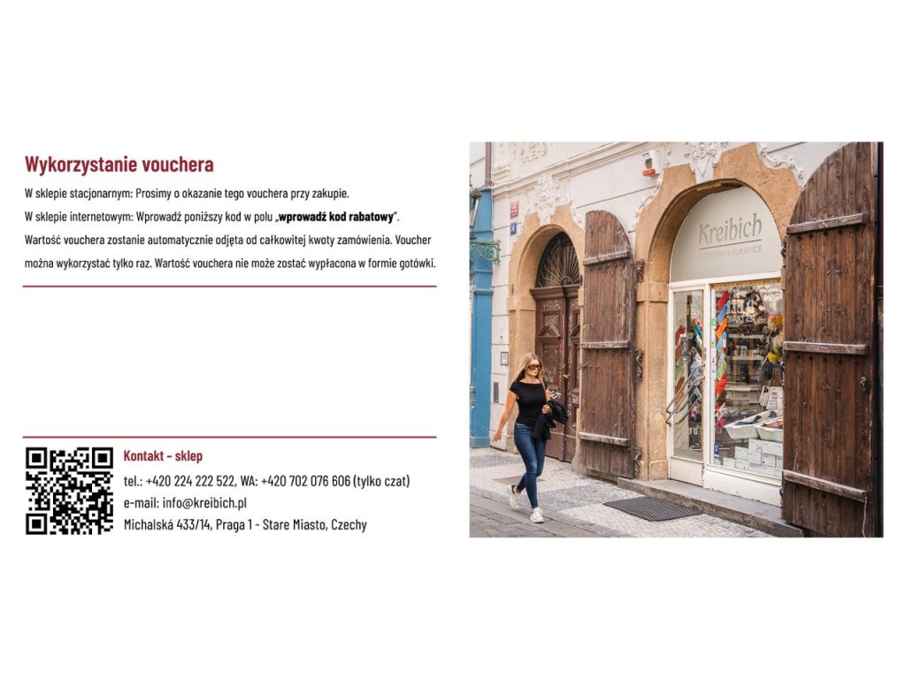 Bon upominkowy możesz zrealizować w sklepie internetowym www.kreibich.pl lub w naszym sklepie stacjonarnym w centrum Pragi. Po autoryzacji zamówienia wyślemy Ci voucher z unikalnym kodem w formie elektronicznej na adres e-mail podany w zamówieniu. Jeśli chcesz otrzymać wydrukowany kupon, dostarczymy go na adres podany w zamówieniu. Voucher jest ważny przez 12 miesięcy i nie podlega wymianie na gotówkę.